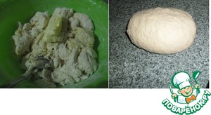 В 50 гр теплого молока растворить 25 г сырых дрожжей +1 ч. л. сахара. Через 20 минут добавить остальное молоко, сметану, майонез, соль, сахар, хорошо перемешать, добавить муку (может понадобиться чуть меньше или больше), всё соединить, влить растительное масло + сливочное масло комнатной температуры. Вымешиваем тесто до однородности и эластичности, скатать в шар. Накрыть плёнкой, оставить на 40 минут в тёплом месте. Вновь тщательно вымесить, оставить до хорошего подъёма, примерно 30-40 минут.
