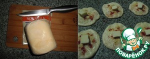 Мягкий сыр (я взяла моцареллу) нарезать на маленькие кубики, разложить их в центр каждой лепешечки.