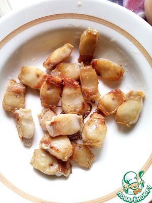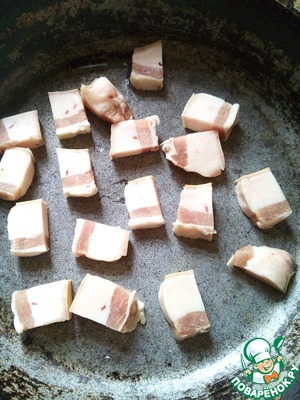 Сначала отдельно на сухой сковороде обжариваем кусочки сала.