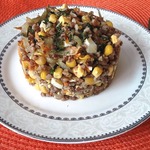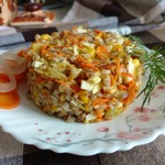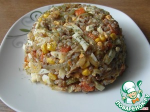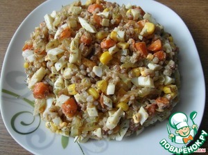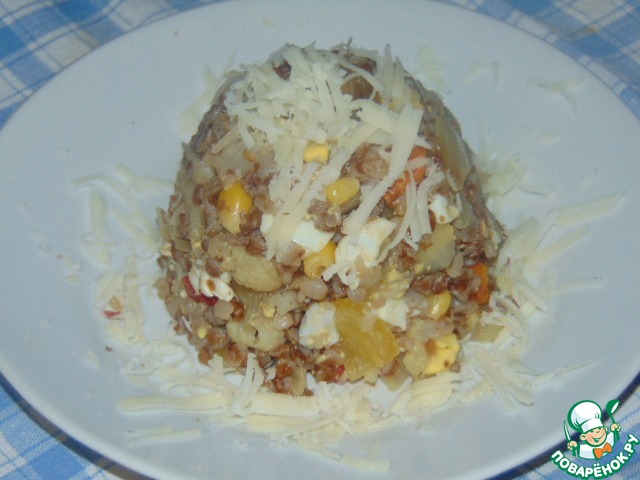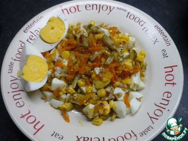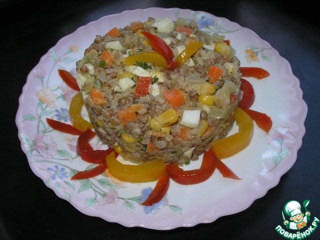 Да... и салат, и гарнир, и каша. Вернее, или то, или другое... Не знаю, как назвать и к какой категории блюд отнести. Все пошло оттого, что как-то в гостях подали гречку как отдельное блюдо, в него входили гречка, яйца и жареный лук. Как ни странно, но мне понравилось, стала дома делать так на гарнир, а тут что-то разошлась: и того захотелось добавить, и другого, чтоб посочнее.