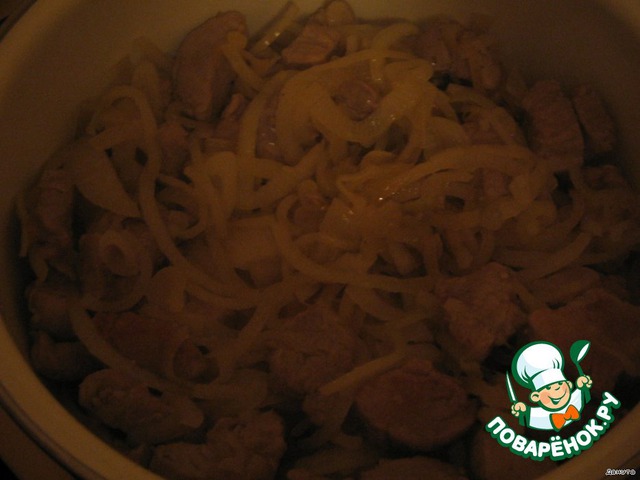 Репчатый лук режем полукольцами. Важно: чем больше лука, тем вкуснее будет мясо. Лучше брать лука столько же, сколько у нас мяса.