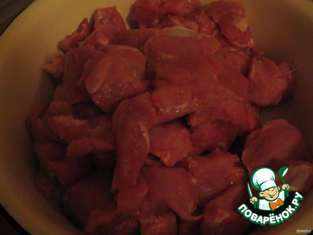 Мясо порезать на кусочки (примерно 4х4 см, но это в идеале, если вы взяли не филе то режьте произвольно).