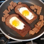 Хлеб обжарила с обной стороны, перевернула, влила яйцо и накрыла сковороду крышкой.