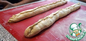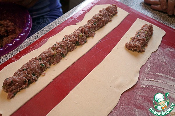 Раскатать тесто тонко, порезать на полоски шириной примерно 4 см. На каждую полоску выложить фарш.