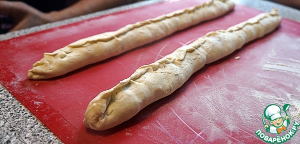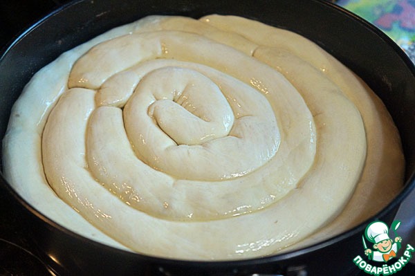 Круглую форму для запекания смазать сливочным маслом, укладывать колбаски из теста с начинкой спиралью.