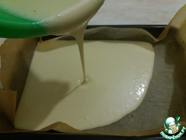 Застелить противень пергаментом (Глубина формы: 4 см; Ширина формы: 22 см; Длина формы: 32 см. Высота пирога приблизительно на глаз по фотографии: где-то 4 см)