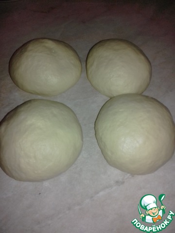 Разделить тесто на 4 части, подкатать, смазать каждую часть растительным маслом, дать ему отдохнуть 10-15 минут. Пишу время через "тире", т. к. многое зависит от качества дрожжей и муки, которыми мы пользуемся, от температуры в помещение.