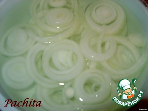 Лук очистить, нарезать кольцами, замариновать в воде с уксусом и сахаром.