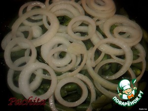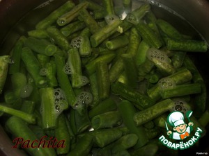Фасоль отварить в кипящей подсоленной воде в течении 1 минуты, воду слить, фасоль охладить.