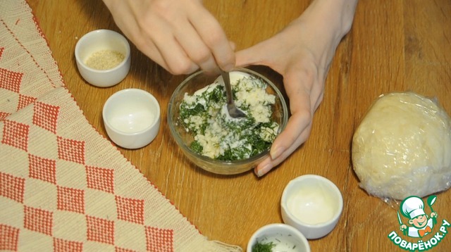 Готовим начинку. Моцареллу нужно натереть на крупной терке, добавить зелень, немного соли и сметану, перемешать.