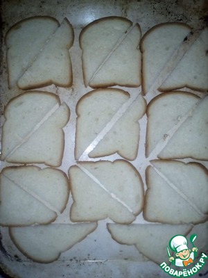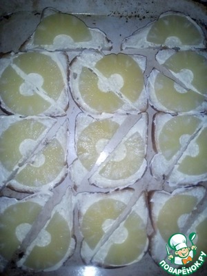 Для этих бутербродов покупаю хлеб тостовый. Каждый кусочек разрезаю по диагонали. Количество кусочков в 2 раза больше, чем шайб ананаса.