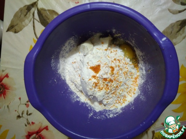 Размягченное масло смешать с сахаром, ванильным сахаром, яйцами, крахмалом, мукй, разрыхлителем, цедрой и молоком.
