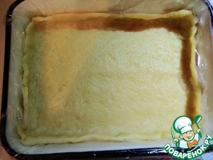 Тесто раскатываем, выкладываем в форму ( у меня 19 на 25), застеленную пекарской бумагой (у меня закончилась, использовала рукав для запекания), делаем бортики (которые так и норовили упасть). В разогретую до 180° духовку на 10 минут.