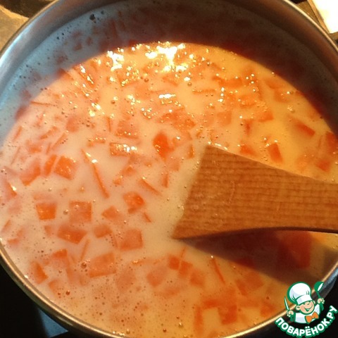 • Как закипит, добавляем тыкву и начинаем по мере выкипания жидкости подливать молоко. Мешаем, мешаем..