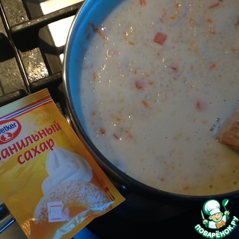 • И к окончанию приготовления каши всыпаем ванильный сахар. Перемешали и накрыли крышкой. Жидкости должно быть не мало, чтобы после 10 минут под крышкой каша была не густая.