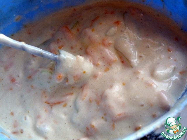 Добавить натертую на мелкой терке тыкву и мелко нашинкованный порей ( можно готовить и с репчатым луком). Перемешать и дать постоять еще минут 15.