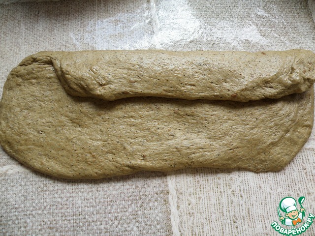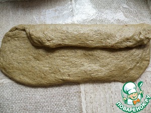 Готовое тесто делю на три части, работая смазанными маслом руками. Каждую часть раскатываю в прямоугольник и сворачиваю в рулет, запечатывая каждый виток.