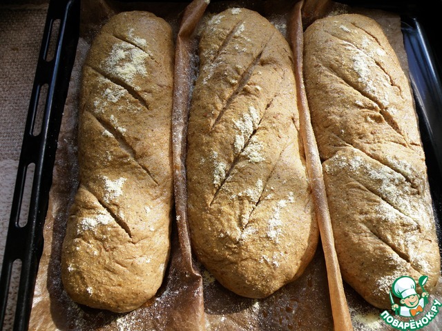 Даю подойти, лезвием делаю косые насечки и присыпаю немного верх батонов кукурузной мукой.