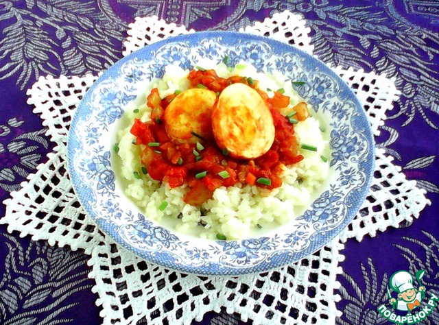 Добавить измельченный чеснок, красный перец, рыбный или соевый соус, томатную пасту, посолить дополнительно, если нужно. Через минуту положить яйца разрезами вниз. Тушить все вместе 3 минуты.