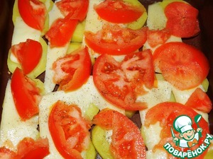 • На сыр выложить слой помидоров, немного посолить и поперчить, положить кусочки масла.