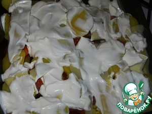 • Далее слои повторяются. Последним должен быть картофель, смазанный сметаной.