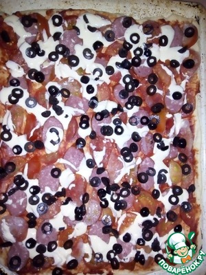 • Далее укладываю начинку. Здесь уж можно пофантазировать. У меня были помидоры, колбаса, маслины. Смешиваю яйца и сметану. Поливаю этой смесью будущую пиццу. Так готовила моя мама.