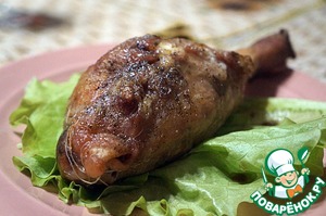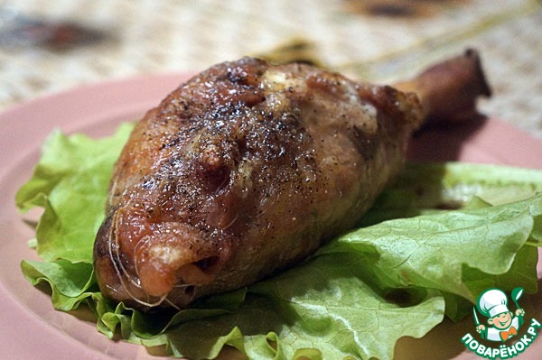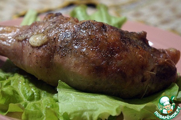 Противень смазать маслом, уложить окорочка швом вверх, смазать майонезом.