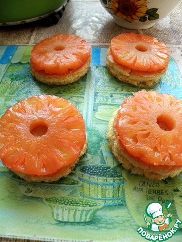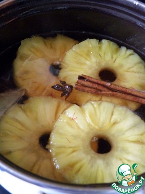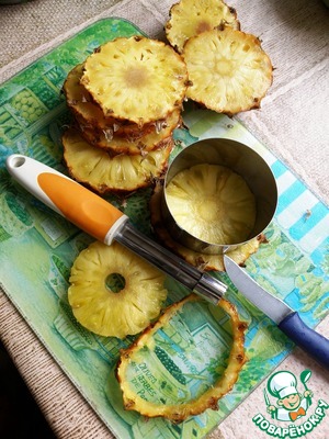 Начать следует с приготовления пряного ананаса. Очистить небольшой и спелый ананас, нарезать кружочками, вырезать сердцевину. Удобно это делать с помощью вырубки-кольца, нарезав ананас кружочками вместе с кожей и выдавив чистую мякоть кольцом подходящего диаметра. А сердцевина отлично убирается яблочной сердцеедкой.