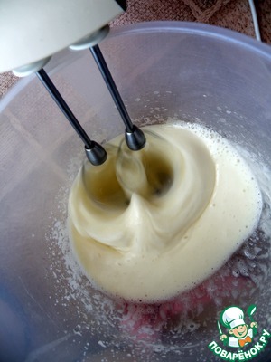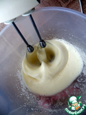 Для бисквита взбить яйца с сахаром и ванилином в крепкую пену. Влить масло и еще взбить до образования кремовой массы. Аккуратно всыпать просеянную муку перемешать лопаткой движениями сверху вниз и по кругу.