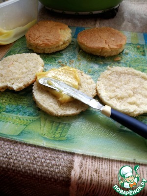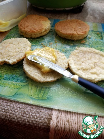 Разрезать вдоль пополам и пропитать сиропом. Щедро промазать нижние половинки лимонным курдом и накрыть верхними.