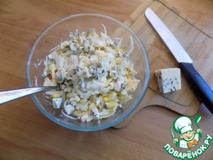 Выкладываем кукурузу, рубим мелко яйца, добавляем сыр голубой. Я его раскрошила руками.