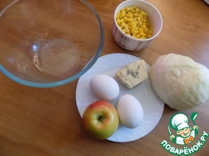 Салат отлично подойдёт на ужин. Легко, вкусно, аппетитно. Салат с сыром Рокфор, яйцом, кукурузой и яблоком.