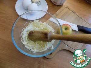 Капусту тонко шинкуем, помещаем в салатник, добавляем щепотку соли и бьём её мялкой. Я использую всегда для этого деревянную мялку для картофеля. Капуста даст немного сок и будет помягче.