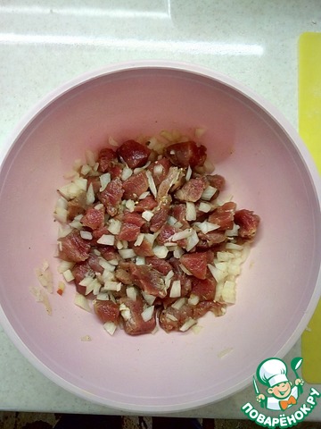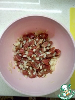 Приготовление начинки: сырое мясо нарезать кубиками, добавить измельчённый лук, посолить, поперчить, добавить любимые специи ( я добавляют приправу к мясу). Обычно я так мясо делаю с вечера и оно маринуется ночь и тогда очень мягкое в пироге.