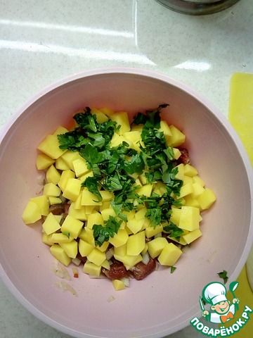 Очищенный картофель тоже нарезать кубиками, добавить зелень и всё перемешать.