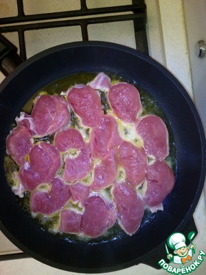 На оливковом масле обжарить свинину, нарезав её ломтиками толщиной 2см., до золотистого цвета. Посолить и поперчить. Выложить на тарелку.