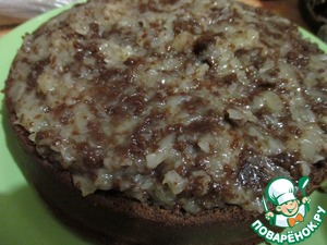 Достать из холодильника торт и залить горячим суфле, распределив его равномерно по поверхности торта.