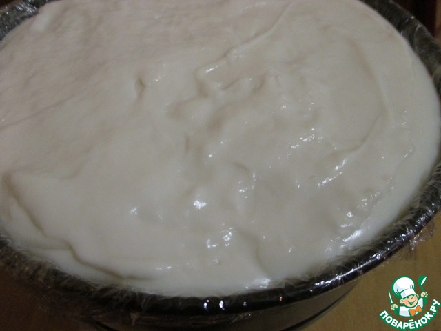 Вернуть корж в выложенную пищевой плёнкой разъёмную форму,. (я забыла это сделать)))потом уже вместе с начинкой пришлось поместить туда.