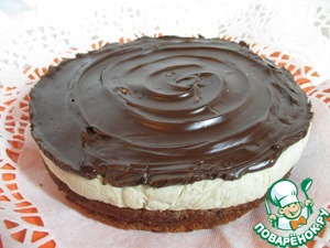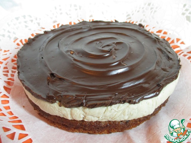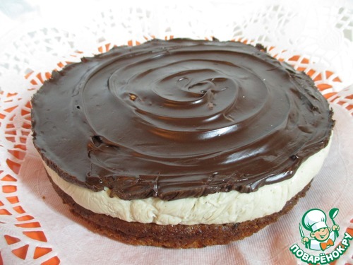 Торт в холодильнике пережил ночь. А утром делаем глазурь из тёмного шоколада (шоколад со сливочным маслом растопить на водяной бане или в микроволновке, перемешать, остудить ) и покрываем ей торт.