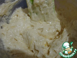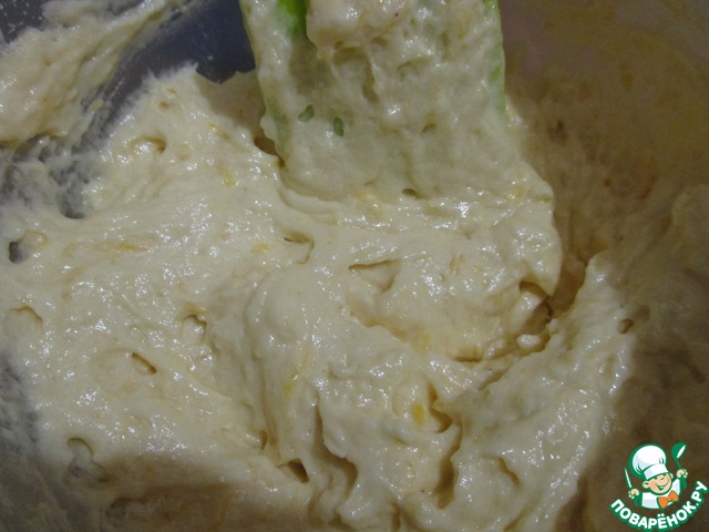 Всыпать просеянную вместе с содой муку. Вымешать тесто лопаткой. Тесто станет пышным, так как сода с лимонным соком вступят во взаимодействие.