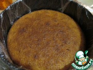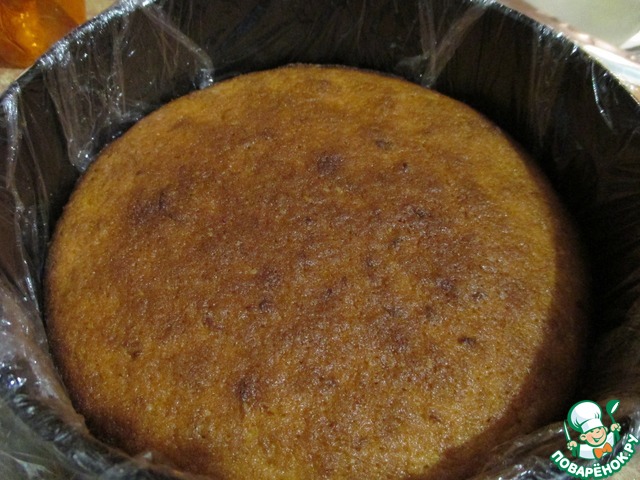 Остудить корж. Вынуть его из формы и застелить форму пищевой плёнкой полностью изнутри. Вернуть корж в форму.