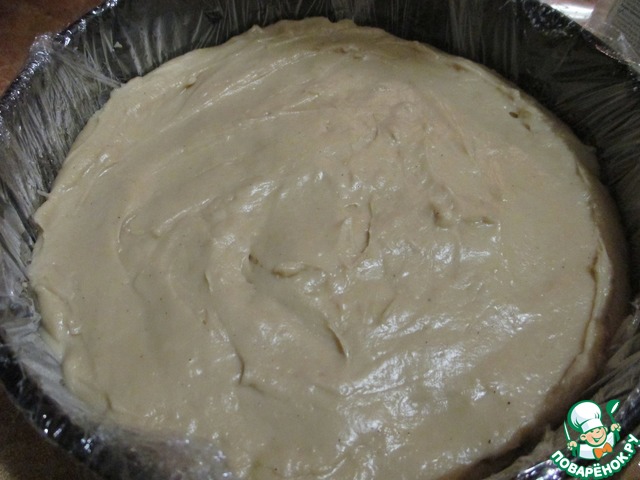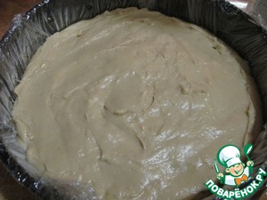 Разъёмную форму для выпечки (18 см) выложить пекарской бумагой и дно, и бока. Бока можно и просто маслом сливочным смазать. Быстро разровнять и поставить в разогретую до 190 градусов духовку.
