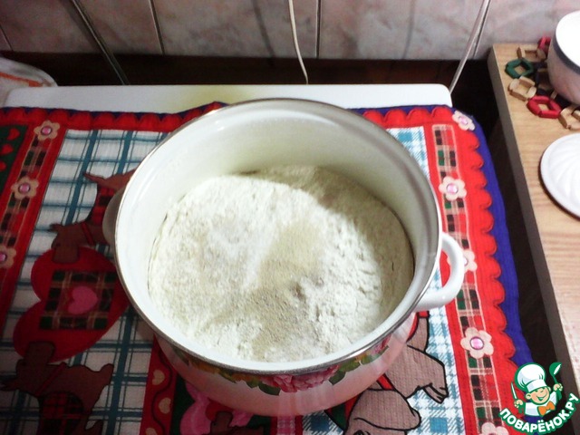 Я замешивала тесто в большой кастрюле и у меня двойная норма продуктов. К просеянной муке добавить соль, дрожжи, чуть теплую воду и масло.