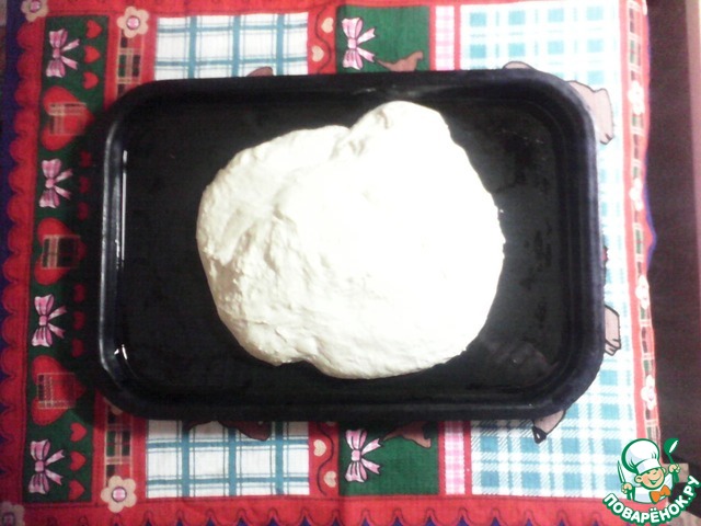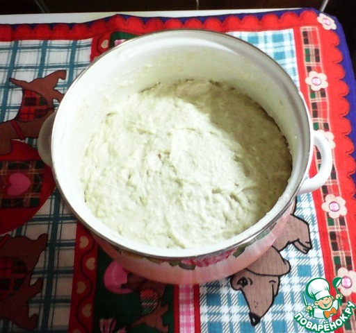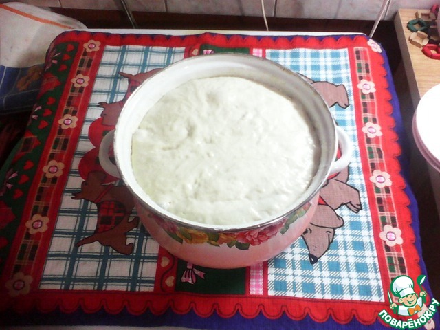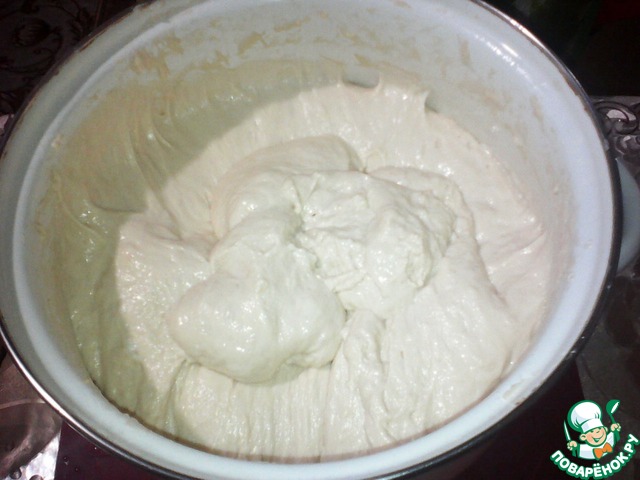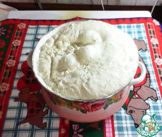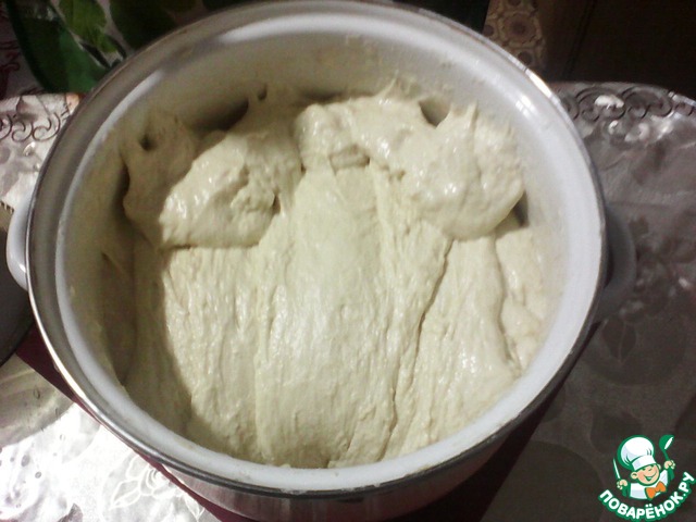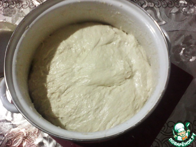 А вот так после часа в холодном месте... Моя кастрюля оказалась маловата и тесто чуть не сбежало:-)