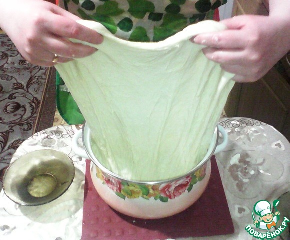 И прижать в середку кучкой. Тесто уже немного изменило свою структуру и тянется без проблем, главное не торопиться...
