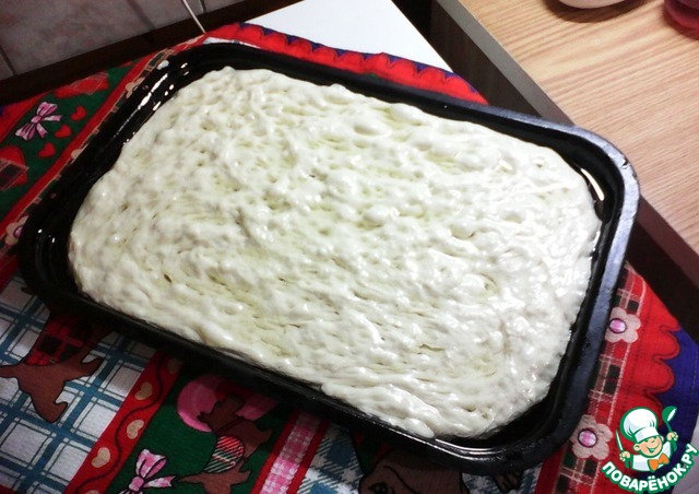 На противень (у меня 40*27см) налить масло, выложить тесто, обмять. Искупать тесто в масле с двух сторон. По рецепту холодное тесто распределяется с тремя интервалами времени, что для меня не очень удобно.