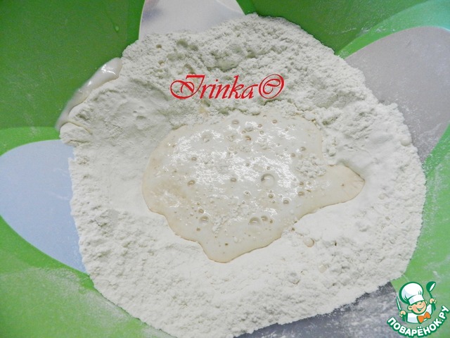 Муку просеиваем с солью в миску (всю муку сразу не сыпьте! оставьте грамм 50), делаем углубление. Выливаем запенившиеся дрожжи.