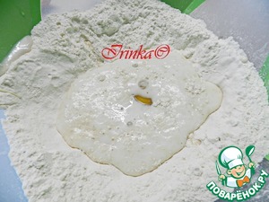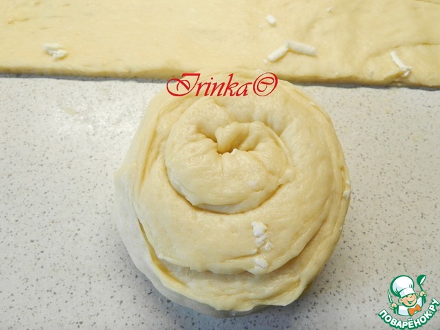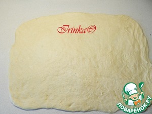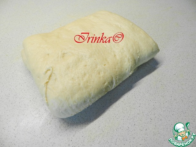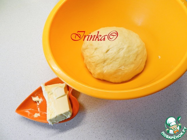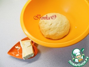 Сливочное масло размягчаем. Смазываем стол маслом, кладем на него тесто и раскатываем до толщины 1,5 см.