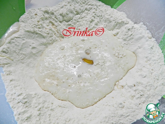 Потихоньку замешиваем тесто, сгребая муку от краев к центру. В середине замеса вливаем оливковое масло.