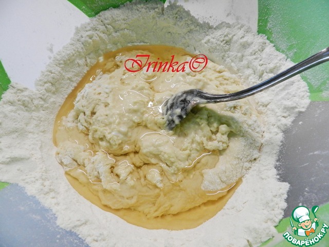 Смотрим по консистенции. Если тесто липнет в рукам-высыпаем остальную муку.